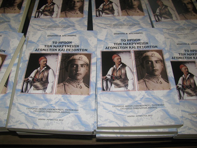 Το κεντρικό συμβούλιο της Παναιτωλοακαρνανικής Συνομοσπονδίας στις 16 Γενάρη 2013 στη στοά του βιβλίου συνδιοργάνωσε με την Αιτωλική Πολιτιστική εταιρία την παρουσίαση του βιβλίου του Αιτωλοακαρνάνα Δημήτρη Αλεξανδρή με τίτλο «ΤΟ ΗΡΩΟΝ ΤΩΝ ΜΑΚΡΥΝΕΙΩΝ ΑΓΩΝΙΣΤΩΝ ΚΑΙ ΠΕΣΟΝΤΩΝ» Έκδοση του συλλόγου Άκρων (Λιθοβουνίου) «ΠΑΝΟΡΑΜΑ» και του συλλόγου Γαβαλιωτών Αθήνας. Εισηγητές του βιβλίου ήταν οι κ.κ ΕΥΑΝΘΗΣ ΧΑΤΖΗΒΑΣΙΛΙΟΥ καθηγητής νεότερης ιστορίας της φιλοσοφικής σχολής του Καποδιστριακού Πανεπιστημίου Αθηνών, ΣΠΥΡΙΔΩΝ ΠΛΟΥΜΙΔΗΣ λέκτορας νεότερης ιστορίας της φιλοσοφικής σχολής του Καποδιστριακού Πανεπιστημίου Αθηνών, ΑΘΑΝΑΣΙΟΣ ΔΗΜΗΤΡΟΥΚΑΣ δικηγόρος, ποινικολόγος, Δρ. Φιλοσοφίας του Δικαίου.